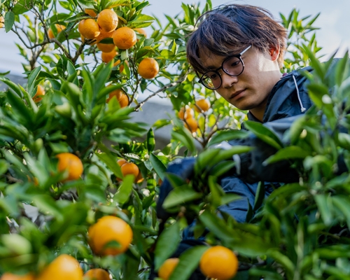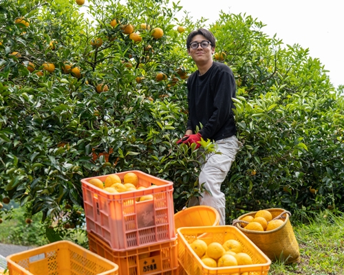 【山下】みかんの収穫です。一日の目標の量を収獲できると達成感が得られるんですよね。それと外国人実習生とワイワイ話しながら作業ができるのも収穫作業ならではです(※)。
