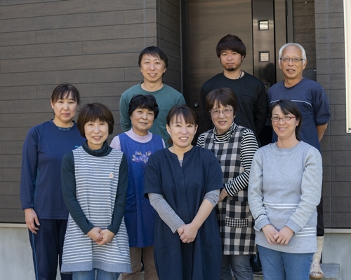青のりのパック詰めを担う網元・祇園丸のみなさん。代表の佐藤吉彦(上段右)は佐藤宏二の弟。