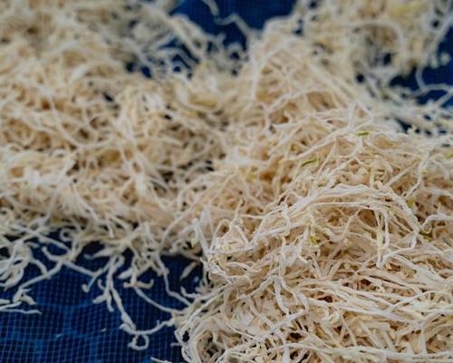 ちりめんは鮮度が命。ちりめんの加工場は海の近くにあり、日の出と共に出発した漁船が戻ると 1秒を惜しむように茹で上げます。漁の最盛期である春と秋は、加工場に併設する干場には真っ白なちりめんが一面に広がり、この様子は漁場の盛んな明浜の原風景。そして漁のない冬場、ちりめんに代わって干場にいっぱいに広がる真っ白な切り干し大根もまた、明浜の中でも狩浜地区の風物詩となっています。
