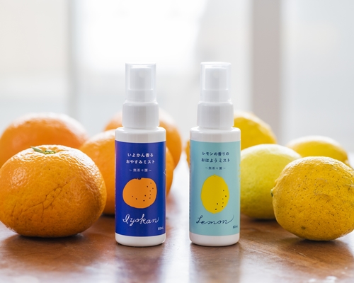 無茶々園の生産者が育てた柑橘の精油と蒸留水で作ったアロマミストです。伊予柑の蒸留水・精油にラベンダー精油を少し加えた「いよかん香るおやすみミスト」は眠る前のリラックスに、レモンの蒸留水。精油にローズマリー精油を加えた「レモンの香りのおはようミスト」は朝起きた時のリフレッシュにお使いください。
