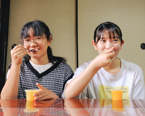 商品案内にたびたび登場している、小さかった姉妹もこんなに大きくなりました。それぞれ忙しいようで、仲良くおやつを食べるような年頃ではなくなってしまいましたが、久しぶりに並んで撮影に応じてくれました。ちなみに食べているのは「寒天みかんゼリー」です。