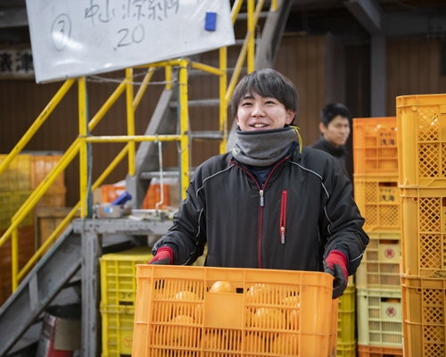 コンテナに入った柑橘を運ぶスタッフ。地元に住む若者も働いています。