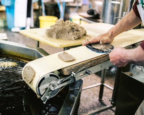 三好さんは競り落とした魚の鮮度や状態を見て製造毎に配合を変え、やわらかくかつ弾力があるものを追い求めます。そうしてできあがったすり身を手で型に押し込み、油の中へ。じゅわ~っと音を立てて揚げあがります。魚の目利き、調整、手押し成型は職人にしかできない技です。