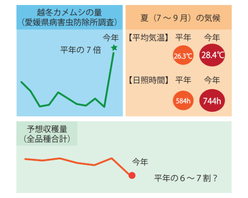 もう一つ原因として考えられるのはカメムシの大発生。カメムシ被害といえば秋のみかんへの食害だったのですが、今年はいつもと違う発生の仕方でした。カメムシも近隣のヒノキ林の豊凶に発生数が左右され、まず昨夏の新成虫が多い状態でした。夏に生まれて翌夏まで生きるカメムシは冬の寒さで一定数に抑えられるものですが、昨冬は気温が高くて越冬しやすい環境に。愛媛県では越冬カメムシの定点調査を行っていますが、何と平年の約7倍の越冬量だったそうです。