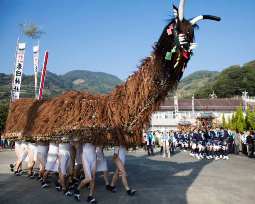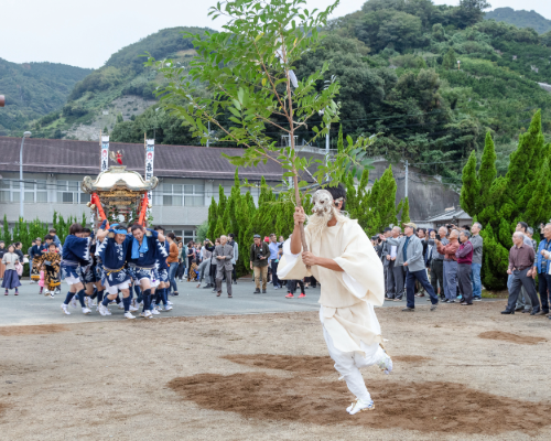 無茶々園事務所のある狩浜地区では10月の第4土曜日に秋祭りが行われます。地域の人々が神輿をはじめ巫女の舞、牛鬼や五つ鹿、 御船、相撲練りなどの役割を担いますがその中の一つ、神輿を先導する「猿田彦」は代々神社に奉仕する家(宮烏:みやがらす)から男子一人が選ばれます。12年前よりこの役を引き継いだ齊藤満天さんに寄稿いただきました。
