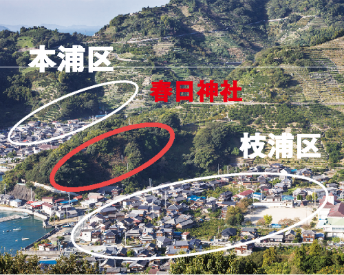 春日神社は本浦区と枝浦区に挟まれた場所にあり、目の前には海が広がっている。(地図参照) 盗人は集落の目につかぬよう海からの逃亡を図る。