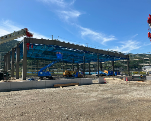 7 月には地鎮祭も行い、建物の建設がはじまりました。いま3か月が経って倉庫の鉄骨や屋根をくみ上げる段階まで進んで