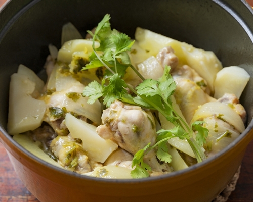 ・鶏肉に火が通ったらじゃがいもを入れて、塩レモン小さじ1を入れて蓋をし、さらに弱火でジャガイモに火が通るまで煮る。(ジャガイモの上に少しずつ塩レモンを置いて蓋をするのがよいでしょう)。