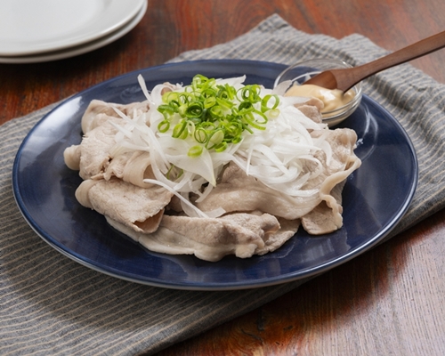 ・タマネギのスライスの水気を切ったものを豚肉にのせネギをのせる。
