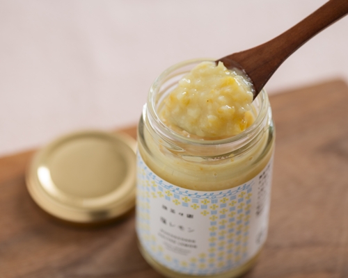 無茶々園の塩レモンは、少しユニークな製法です。フードプロセッサーでレモンを丸ごとミンチにしてから、塩(全体の17%)とともに漬け込んでいます。果実感がしっかり残り、爽やかでコクのある風味に仕上がっているのが特長。そのまま料理に加えるのはもちろん、ペースト状なので使い勝手も抜群です。