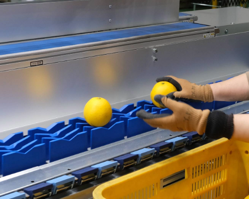 まず最初に人の手で一玉一玉果実を載せます。カメラに映らない裏側の傷や、判別しにくいタイプの傷がないかの確認をし、カメラの範囲から外れないように適切な位置に置きます。甘夏やジューシーフルーツのように大きめの品種は、間隔をあけて置くなどの必要があります。ここで置き方が不適切だとカメラが判定できず機械全体が停止してしまいます。また、カメラも万能ではなく傷みが判定されず通過する場合もあり、最終的に箱に入る段階での確認も必要です。