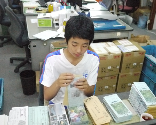 その昔、無茶々園では、お届けするみかんの送り状を生産者が夜なべして手書きしていました。今でこそ送り状は自動で印刷できるようになりましたが、「天歩」には現代社会では驚くほど手作業が多く残っています。封筒の宛名シール貼りに始まり、「天歩」と他のチラシを組み合わせる作業もすべて社内で行っています。