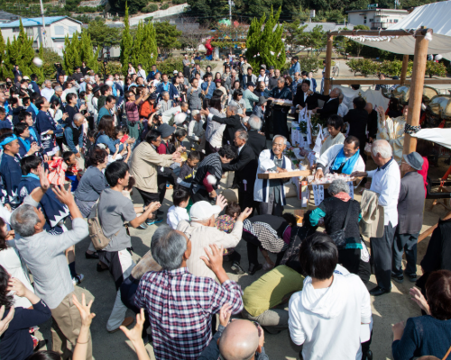 長い準備期間を経て、いよいよ祭り当日を迎えます。早朝5時。掛け声と貝(笛)の音が響き渡り、牛鬼組が出発します。緊張と高揚が入り混じった独特な雰囲気に包まれ、長い1日が始まります。集落では1年で最も活気づく一日でもあります。各御旅所で暴れる牛鬼に悲鳴を上げながら逃げ惑う人の姿、子どもたちの練りを見守りながら微笑むお年寄りの姿。地域内外から多くの人が訪れ、狩浜全体が熱気と笑顔に包まれます。そしてフィナーレを飾るのは「宮入り」。3体の神輿が石段を一気に駆け上がる光景は圧巻。歓声と太鼓の音が響き渡り、活気が一段と高まります。