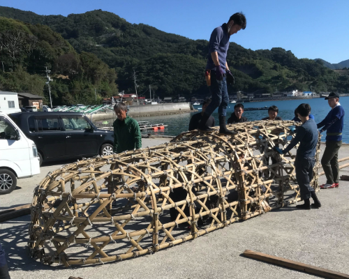 祭の約2週間前、牛鬼組は山へ入り、竹やカズラを採取します。これらは牛鬼の胴体部分である「かご」を作るための材料です。かごは「貝の口」「担い棒」「横棒」などの部品と組み合わせて作られます。