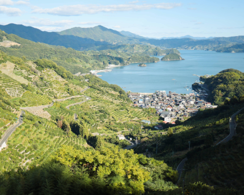 明浜の段々畑の風景。みかん畑と住宅が近い。