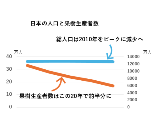 基盤整備が困難な傾斜地の畑が多く、機械を活用できる作業が少ないのが果樹栽培の特性でもあります。米なら来年作付を増やすことも容易ですが、果樹は植えてから収穫までに何年も要するため、一旦下がった生産量はそう簡単には回復できません。長期育成型であることが目の前の需給の調整をより難しくしています。