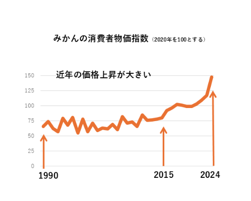 消費者物価指数を見ると、みかんの価格はバブル経済が終わる1990年頃から30年近くほぼ横ばいで豊作不作による上下だけが繰り返されていました。2015年頃から緩やかに上昇がはじまり、2022年から上昇幅が拡大。2024年には急上昇して今に至っています。