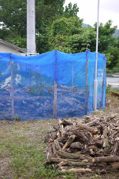 無茶々園の明浜事務所の近く、青いネットと内外に積まれている木。さて、これはいったいなんでしょう??