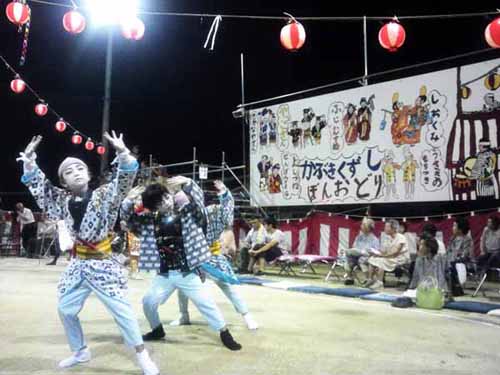 夏になると小学生から大人まで公民館に集まり、夜な夜な練習を繰り返し本番を迎えます。