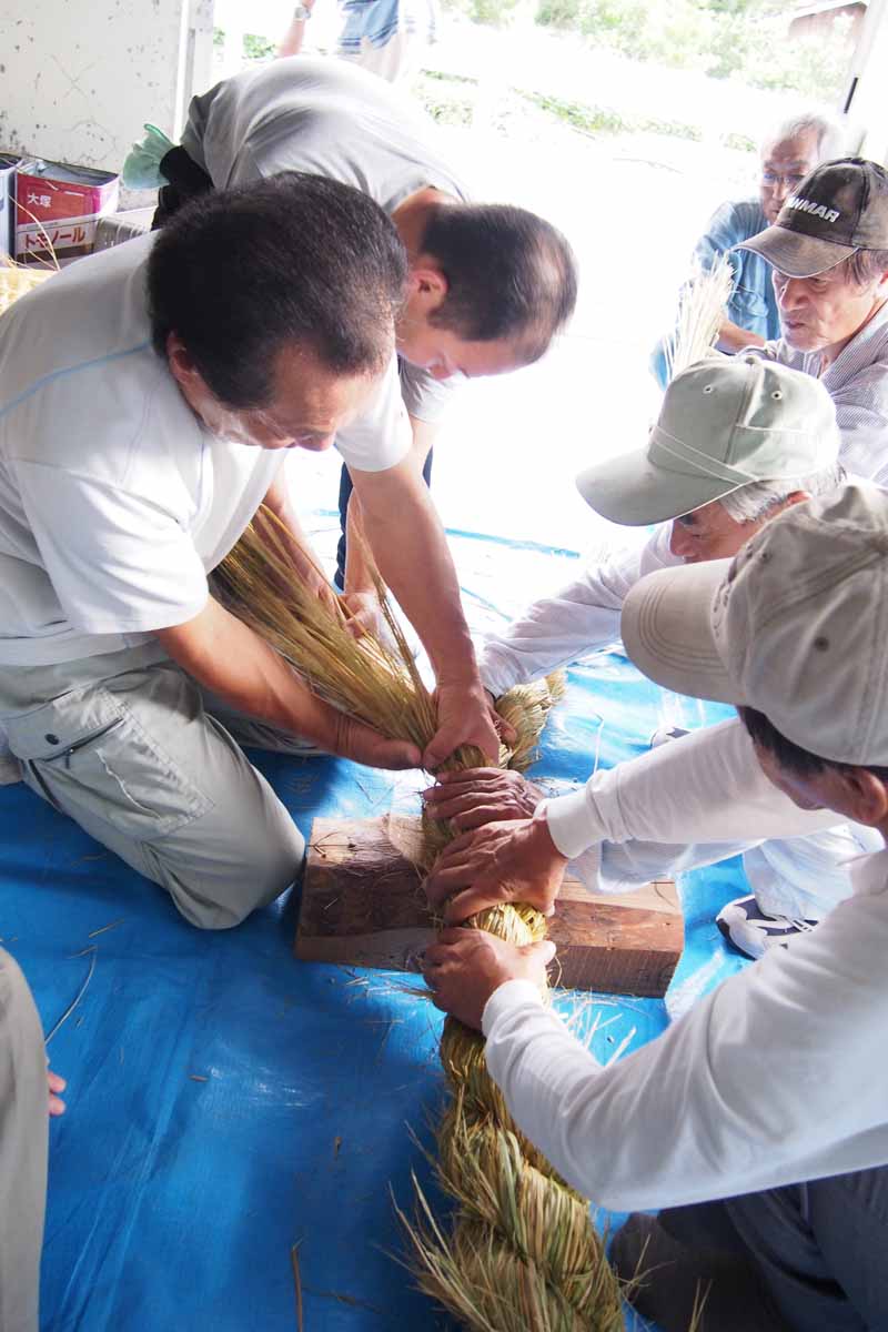 力を合わせて束を少しづつ増やしながら編み上げていきます。