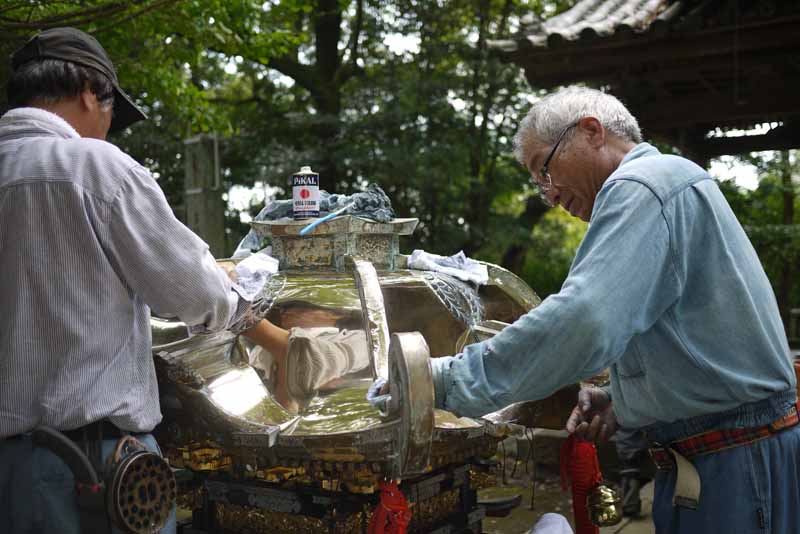 神輿は一年の汚れを落として丁寧に磨かれ、輝きを取り戻していきます。