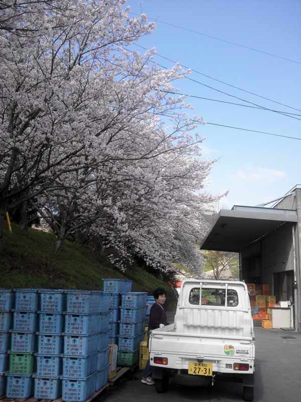 事務所前の桜が満開です。 いつもの出荷作業ですが、桜の下だとそれだけで気持ちがよさそうです。