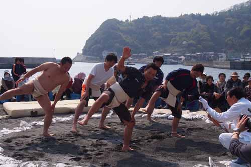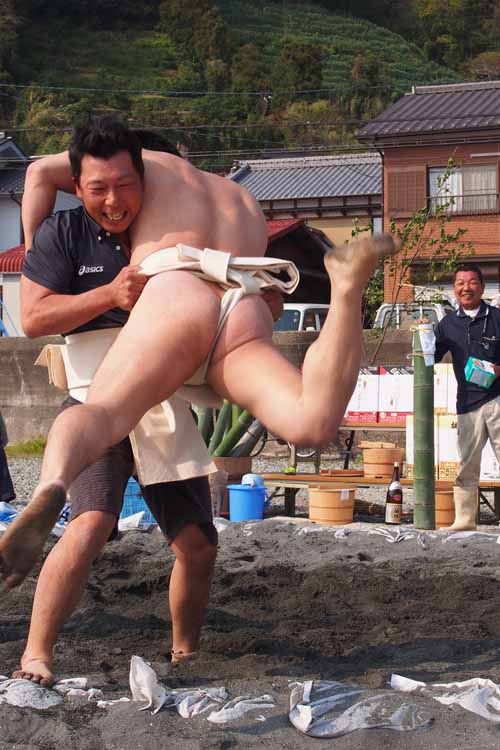 圧巻の取組。奉納相撲は毎年4月10日に開催されます。ぜひ田之浜で見てはいかがでしょう??