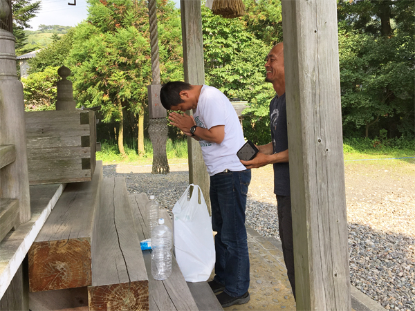 まずは神社にお参り。酒、米、塩の供物を捧げる。