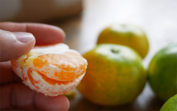 外皮をむけばオレンジの果肉が顔を出し、お馴染みのみかんの香りが広がります。