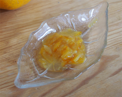 明浜では酢みかんとして親しんできたかぶすの果皮を砂糖で甘く炊き、本場風にマーマレードへ。