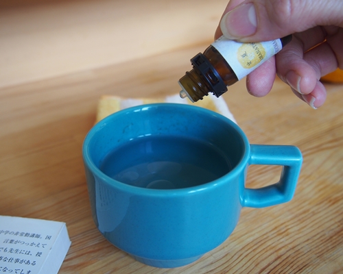 部屋の中でゆっくり過ごしたいとき、仕事とプライベートとの気持ちを切り替えたいときにエッセンシャルオイルをよく使っています。こう話すのは週末に家の中でエッセンシャルオイルを使っているという無茶々園スタッフの岩下。芳香用の機材を持っていないので、マグカップにお湯を入れ、エッセンシャルオイルを3~5滴入れています。テーブルの上に置いて、香りを楽しみながら本を読んだり、趣味のアクセサリーを作ったり、好きな音楽を聴いたりします。甘夏はほっとできる香りなので、ほのかに香る程度が丁度いいですね。