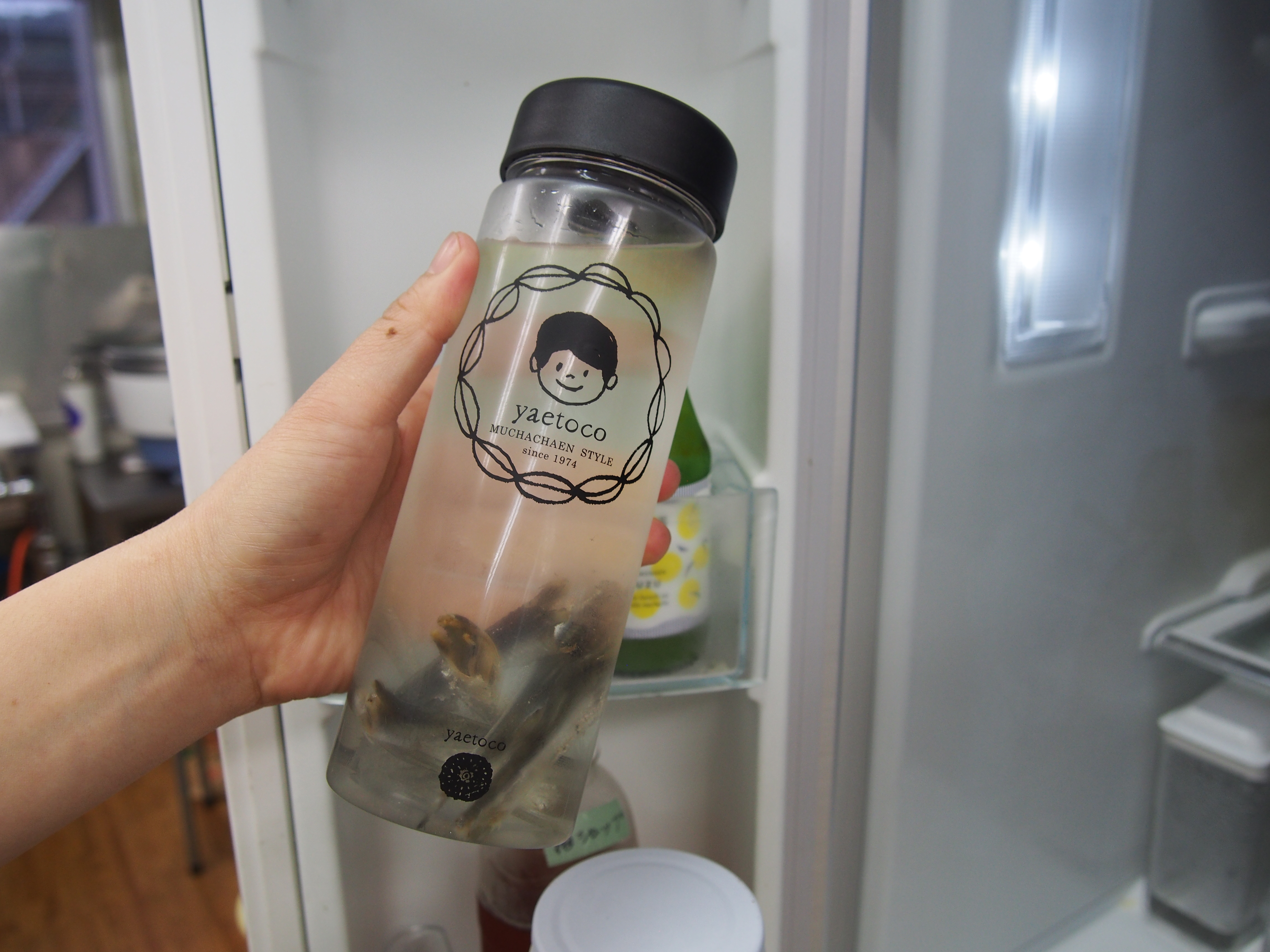 ドリンクボトルを冷蔵庫に入れて出汁の作り置きをしている高瀬。