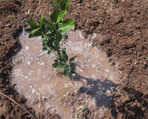 その他にも水が畑の表面を流れてしまわないように植えた苗木の周りには土俵のように土を盛るなど、