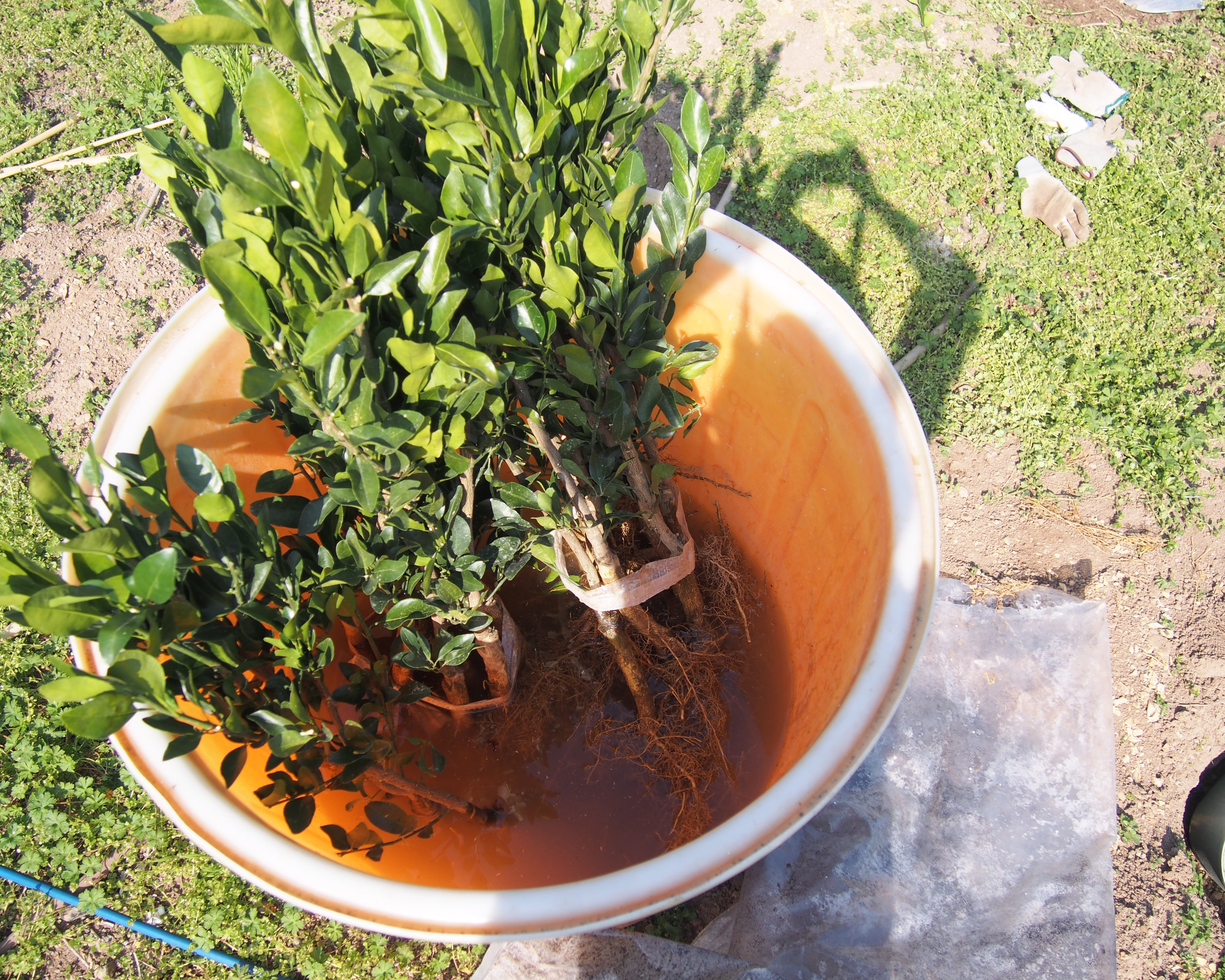 まずは下の根っこを土で覆い、それから残りにも土をかけていきます。