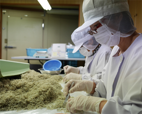選別作業。ちりめん以外のものを選り分けています。根気と集中力が必要な仕事です。