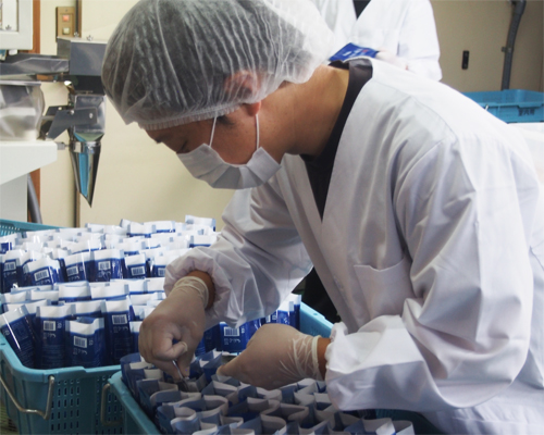 パックに入っている乾燥材も一つずつ手作業で入れています。