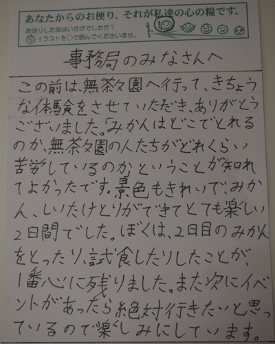 その後、T君から事務局へも嬉しいお葉書が届きました。