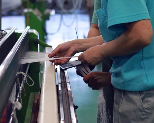機械で織物を織り上げる製織(製織)作業へ。