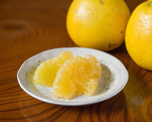 さて、ジューシーフルーツの食べ方ですが、内皮まできちんと剥いて食べるのが一番のおすすめです。果肉が持つやさしい甘み、さわやかな酸味、初夏の柑橘らしい風味をしっかり感じることができます。内皮まで剥くのは少々面倒ですが、手間暇かけるに値する美味しさです。