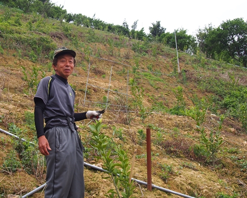亮尚さんの土砂が流れた畑には温州みかんの苗木が植えられています。「これからきちんと育つのかは分からんが、みかんを信じて世話していくだけよ」と苦労の中にも期待の心が垣間見えました。この畑の温州みかんがたわわに実をならすのは数年後。畑の復旧への道のりはまだまだ長くも、一歩ずつ確実に進んでいます。