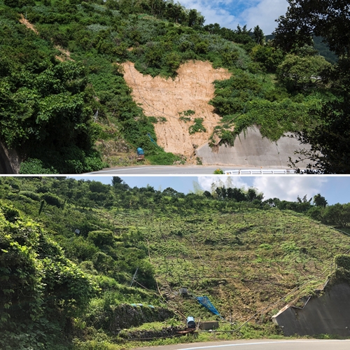 上:豪雨から1か月 下:1年が過ぎ、モノラックの修理も進んだ。