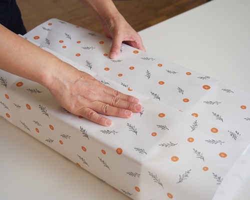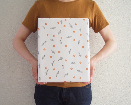 無茶々園に新しく、みかん柄のかわいい包装紙ができました。柑橘をお届けの際のダンボールと同じく、段々畑の石灰岩をイメージした白色の背景に、みかんの果実と葉っぱのデザインが描かれています。包装紙のデザインは、ジュースやてんぽ印の乾物でお馴染みの井上真季さんにお願いしました。なお、ギフト包装は無料にて承っております。お気軽にお申し付けください。ちょっとしたお礼の品やお祝い事で頂いても嬉しいですね。