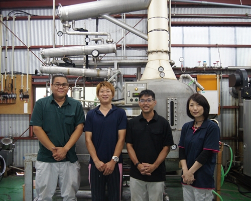 左から従業員の佐々木さん、林さん、工場長の堀川さん、営業担当の小野川さん。