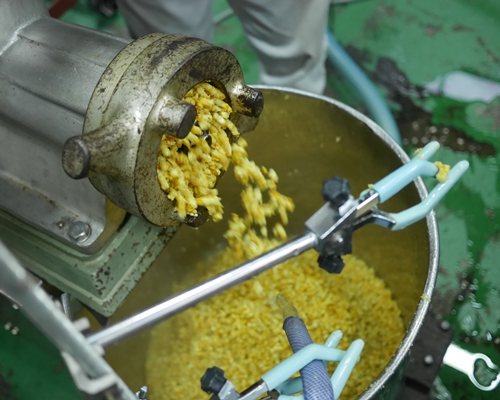 まずは果皮の下処理。検品しながら少しずつ果皮をミンチ状に。こうすることで、より多くのエッセンシャルオイルが取ることができます。今回お願いした甘夏果皮は約3t。ここでの果皮とは、手剥きして果肉を取り出した状態のもの。早朝から作業を開始し、1日約150~170㎏、20日ほどかけて行います。