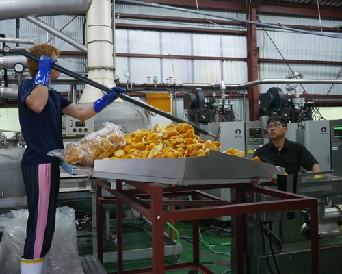 甘夏果皮を検品しながらミンチャーに流す作業。