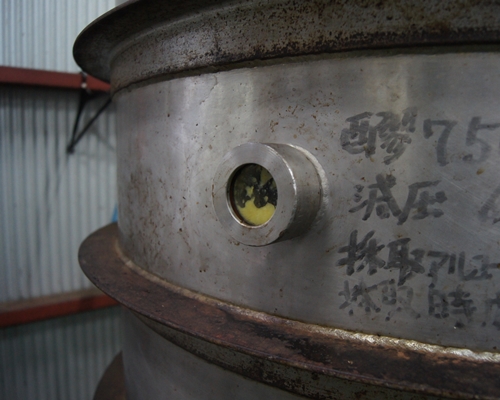 さて、ここまでが果皮の仕込み作業。いよいよ蒸留作業に入ります。巨大な窯にペースト状にした果皮入れ、香りを損なわないように、温度調整に気を使いながら一日かけてじっくり熱します。果皮の量も膨大なので、数日に分けて実施。本当に時間と手間暇がかかる作業です。