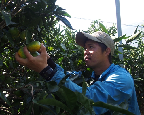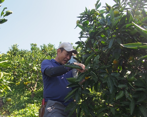 明浜事務所から車で西に5分ほどのところにある「ナガレ」という畑で早採りみかんを収穫していたのは、宇都宮利治さん、宏生さん親子。この日は「(実が)たくさんあるから」と実習生のテイくんと近所の頼もしい助人ご夫婦とともに来ていました。