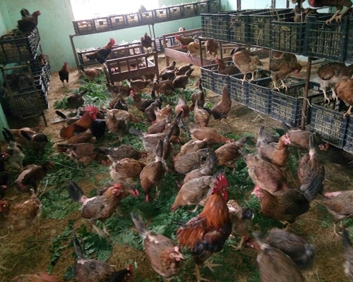 鶏たちは毎朝の給餌を心待ちにしており、朝は鶏舎の入口に鶏たちが押し寄せます。外気温が上がってくると、雨の日以外は鶏舎を開け、屋外で遊ばせます。
