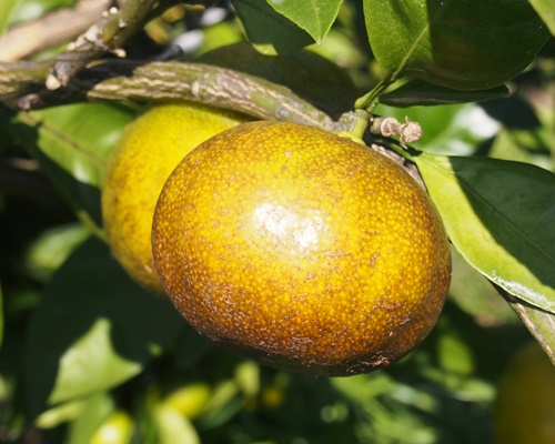 高温多湿の梅雨から夏にかけて病害虫の活動は最も活発になります。それだけ栽培管理上で対策が必要になる時期であり、一般的には農薬の使用回数が増える季節です。暑さがピークを越えると影響は小さくなっていきますが、夏の対策は継続して行われます。無茶々園ではサビダニやカイヨウ病への対策が続きます。特に体が小さく発生や加害が見えにくいサビダニは、秋になってから被害がようやく目に見える形で現れ、急いで対策に走らなければならないことがあります。最近は温暖化で秋の気温が高く、こうした夏の病虫害が収まりにくくなってきた気がします。
