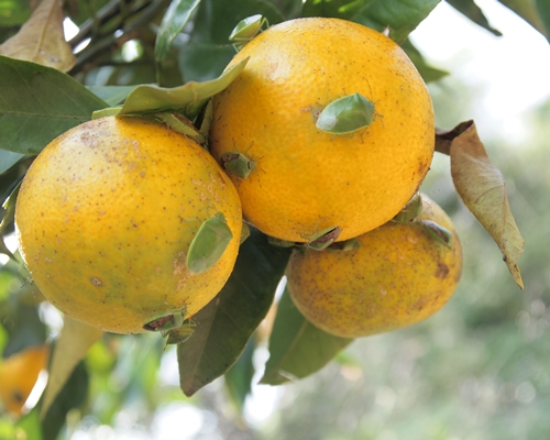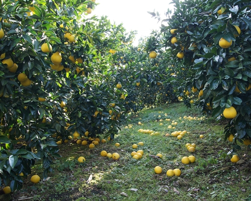 秋が深まりみかんが橙色に色づくころには病害虫による影響もほとんど収束します。果実も成熟が進み、今度はイノシシや鳥などの食害がはじまる時期ですが、動物対策での農薬使用はなく柵を設置するなどの物理的な対策を行っています。また、生理現象や冬の強風によって果実が落下することがあります。特にジューシーフルーツ(河内晩柑)はこの生理落果を起こしやすく、無茶々園でも11月に落下防止の農薬使用を行うようにしています。